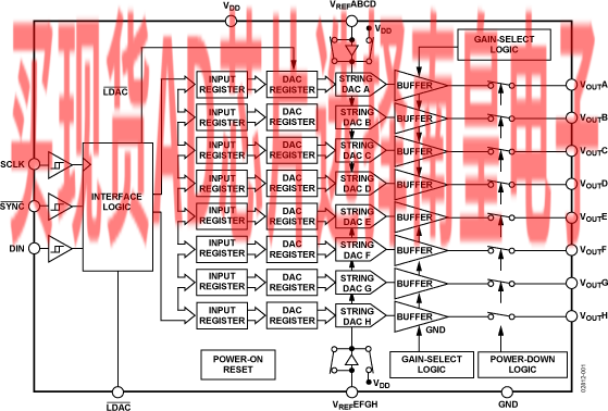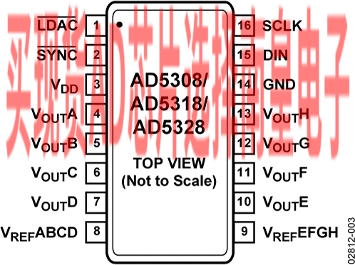 - AD5328:一个16引脚TSSOP封装中集成8个缓冲12位DAC,A级:±16 LSB INL,B级:±12 LSB INL