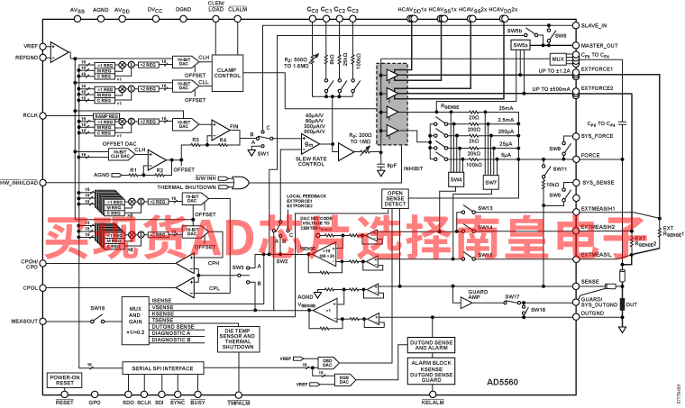 AD5560是一款高性能、高集成度器件电源,提供可编程的驱动电压和测量范围。该产品包括所需的DAC电平,用以设置驱动放大器的可编程输入,此外还包括箝位和比较器电路。片内集成用于DAC功能的失调和增益校正功能。它提供多种可编程测量电流范围,包括五种内部固定范围和两种分别提供最高1.2 A和500 mA电流的外部可选范围(EXTFORCE1和EXTFORCE2)。高电流电平时可实现的电压范围受裕量和最大功耗限制。通过并联或联合多个DPS器件,可以实现1.2 A以上的电流范围或高电流与高电压组合。发生过流、过温状况时,它会提供开漏报警输出,或者在SENSE、DUTGND线上提供开尔文报警。