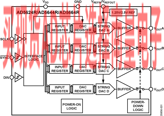 AD5624R/AD5644R/AD5664R均属于nanoDAC系列,分别是低功耗、四通道、12/14/16位缓冲电压输出数模转换器(DAC),采用2.7 V至5.5 V单电源供电,通过设计保证单调性。