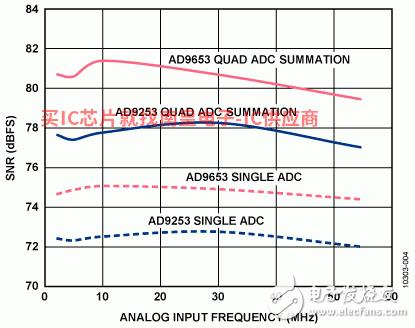 请注意,使用四通道求和技术可以增加14位ADC AD9253 在 10 MHz时的SNR,增加量约为5dB。16位ADC AD9653 的SNR增加量大致相同。