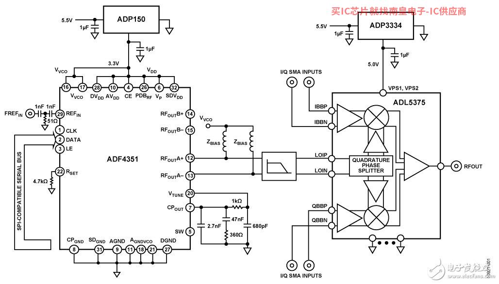 图1. 直接变频发射机(原理)AD中国代理商示意图:所有连接和去耦均未显示)