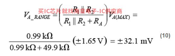 由于DAC可以摆动±1.65 V,因此,总失调的范围可以通过RA以及R1和R2的并联组合形成的分压器给定,其计算方法如下: