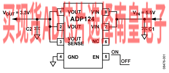 ADP124/ADP125具有内部软启动功能,启动时间恒定为350 μs。短路保护和热过载保护电路可以防止器件在不利条件下受损。这些器件采用8引脚裸露焊盘MSOP封装。与标准MSOP封装相比,裸露焊盘MSOP封装的热阻(θJA)更低。这使得ADP124/ADP125能够满足各种便携式应用的需要,同时可将结温升幅降至低点。