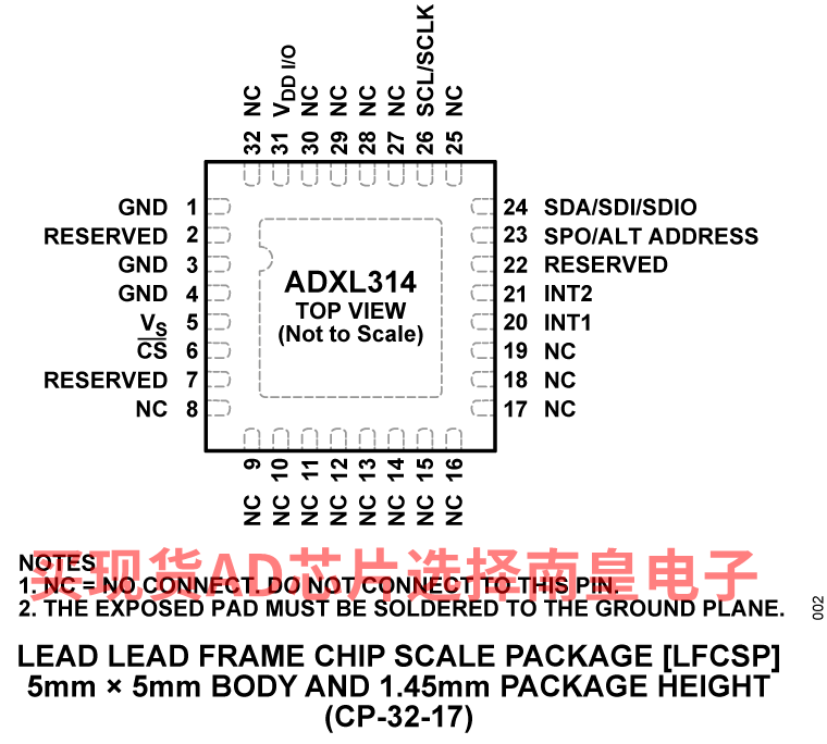 ADXL314采用5 mm × 5 mm × 1.45 mm、32引脚小型纤薄LFCSP封装。