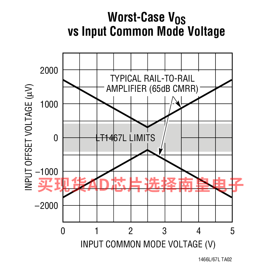 和其他的轨至轨放大器不同,LT1466L / LT1467L 最大值为 390μV 的输入失调电压在整个轨至轨输入范围内 (而不仅仅是在半电源电压) 得到保证。在下面的曲线图中,把 LT1466L / LT1467L 与一款仅规格在半电源电压的同类竞争器件的 VOS 性能指标进行了对比。由图可见,对于接近任一个电源电压的输入,LT1466L / LT1467L 的限制要严紧得多。