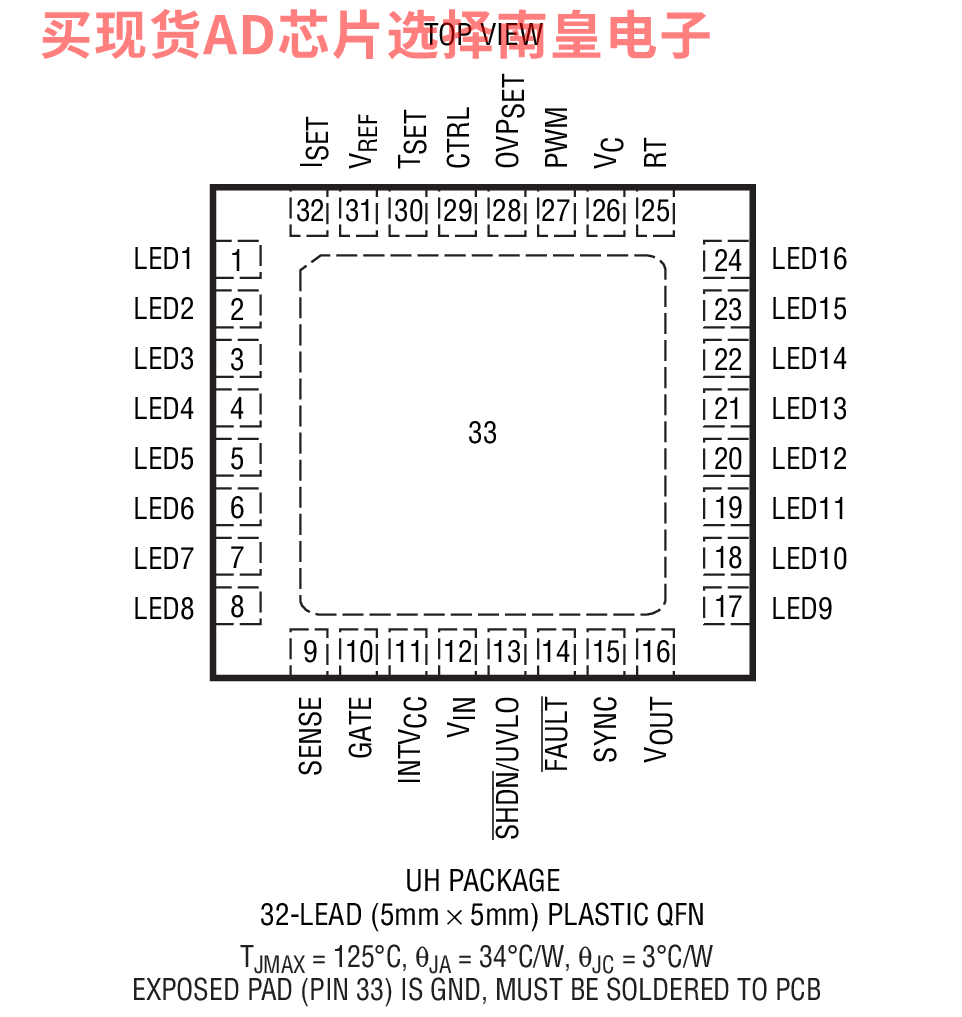 LT3754IUH#TRPBF,封装:32-Lead QFN (5mm x 5mm x 0.75mm w/ EP),包装形式及数量:卷带,2500,工作温度:-40 to 125C,AD官网报价:6.79(100-499个);5.57(1000+个)