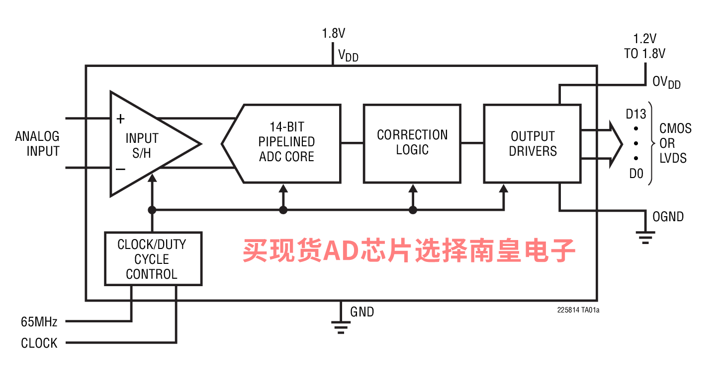 数字输出可以是全速率 CMOS、双倍数据速率 CMOS 或双倍数据速率 LVDS。一个单独的输出电源提供了 1.2V 至 1.8V 的 CMOS 输出摆幅。