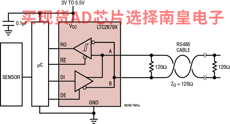 LTC2879X 满足 RS485、RS422 和 PROFIBUS-DP 规范,其电源电压范围为 4.5V 至 5.5V,在低至 3V 电压下与 RS485/RS422 完全兼容。