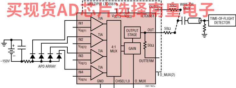 LTC6561 是一款低噪声、四通道、跨阻抗放大器 (TIA),具有 220MHz 带宽。LTC6561 多通道跨阻抗放大器具有低噪声、高阻抗和低功耗特性,因而适合于使用雪崩光电二极管 (APD) 的 LIDAR 接收器。此放大器具有 74kΩ 的跨阻抗增益和 30µA 的线性输入电流范围。使用总电容为 2pF 的 APD 输入电路,200MHz 时的输入电流噪声密度为 4.5pA/√Hz。在电容较低的情况下,噪声和带宽也会进一步改善。该器件只需要 5V 单电源,并且仅消耗 220mW。利用内部 4 对 1 多路复用器以及 LTC6561 的输出多路复用器,可以组合多个 4 通道 LTC6561 器件以直接与 12、16 和 32 通道 APD 阵列相连接。LTC6561 的快速过载恢复和快速通道切换特性使其适合具有多个 APD 的 LIDAR 接收器。在 100Ω 负载条件下,其单端输出可以摆动 2VP-P,而其低阻抗运放型输出能够驱动向后设终端的 50Ω 电缆。