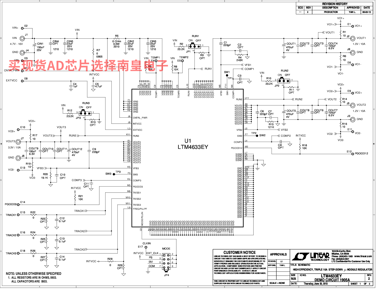 ADEF(相控阵、雷达、电子战、卫星通信) 通信基础设施(多频段5G和毫米波5G) 电子测试与测量DC1905A:LTM4633 Demo Board | Triple Buck µModule Regulator, 4.7V ≤ VIN ≤ 16V, VOUT1 & VOUT2 = 0.8V to 1.8V @ 10A, VOUT3 = 0.8V to 5.5V @ 10A